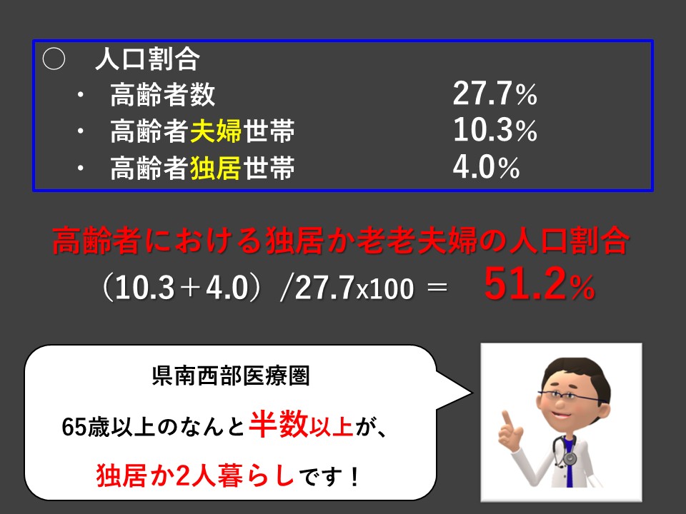 50%以上、肌間隔では6割ぐらいの高齢者が、独居か2人暮らしです。
