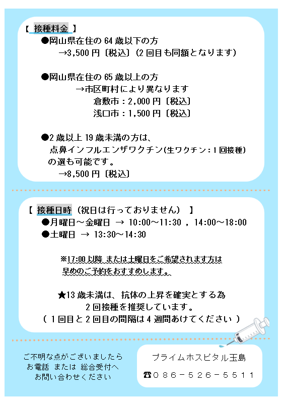メニュー ホーム プライムホスピタル玉島について 診療科のご案内 部門のご紹介 ご利用者の方へ 病院施設のご案内 院長のささやき 空床情報(PDF) 採用情報 関連施設のご案内 お問い合わせ お問い合せ お電話でのお問い合わせ086-526-5511 メールでのお問い合わせ トップページ 病院からのお知らせ インフルエンザ予防接種開始のご案内 病院からのお知らせ 2025.10.02 インフルエンザ予防接種開始のご案内 点鼻インフルエンザワクチンのご予約はオンラインまたは窓口での受付となります。 お電話でのご予約は承れませんのでご了承ください。 web予約はこちら 診療時間を見る(PDF) 診療科のご案内 トップページへ